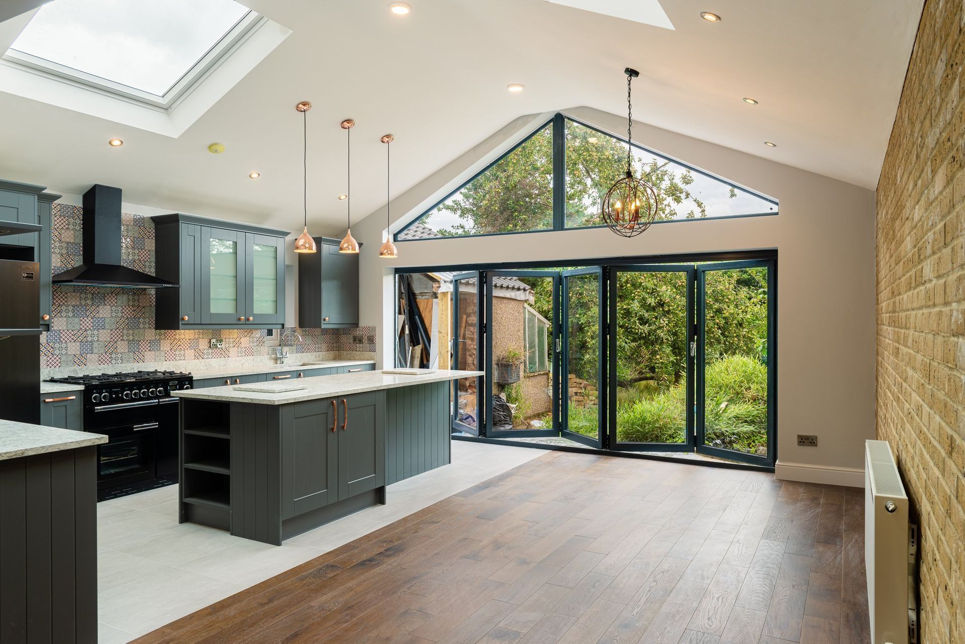 We reconfigured the property with structural wall removal, steel beams, and a modern rear/side extension featuring skylights, a roof lantern and bi-fold doors.